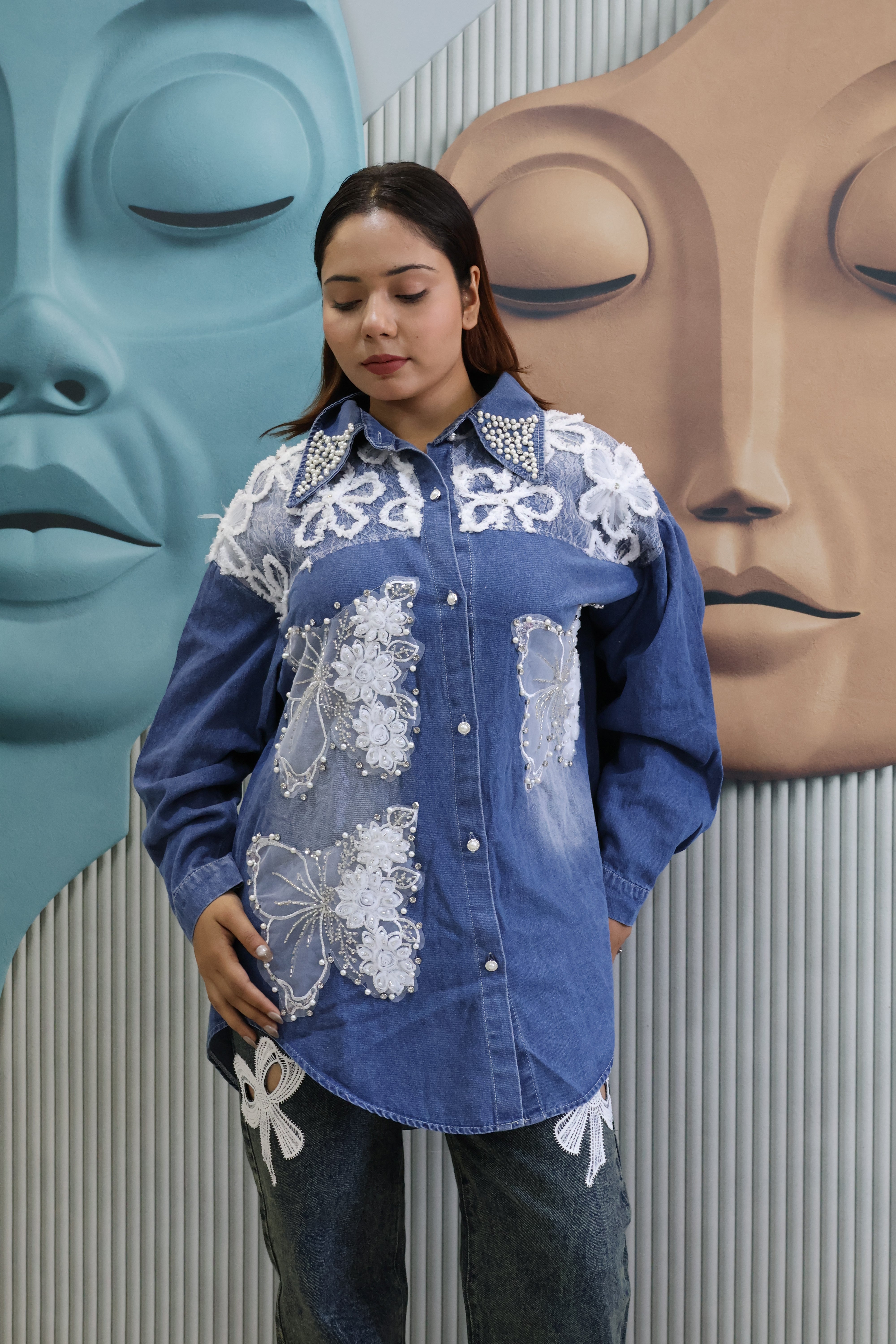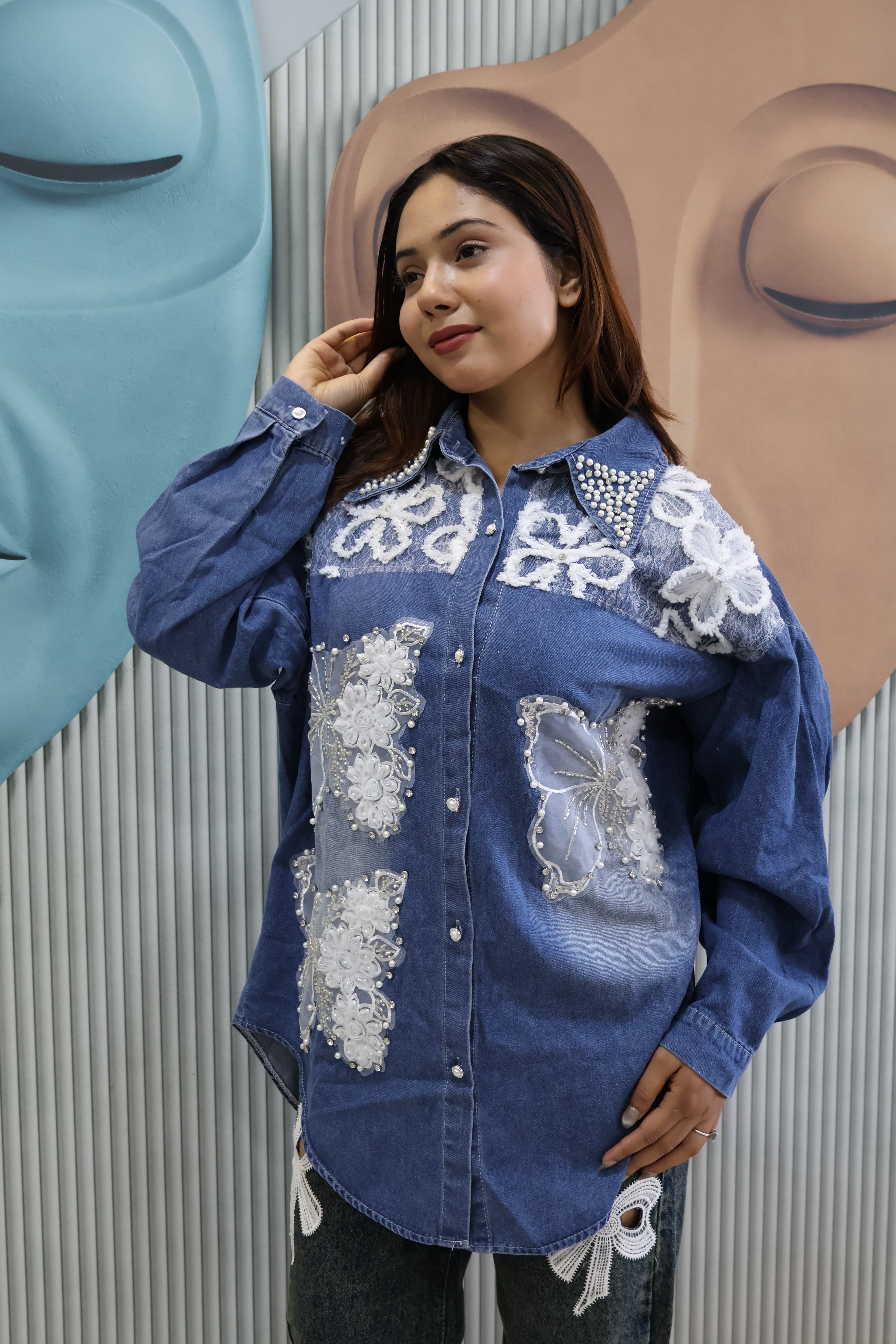 Make a bold style statement with this Women’s Denim Shacket (Jacket-Style Shirt), designed for a modern, fashion-forward look. Crafted from premium denim fabric, this piece features butterfly applique work with lace panels and pearl embellishments, creating a luxury designer finish without embroidery.