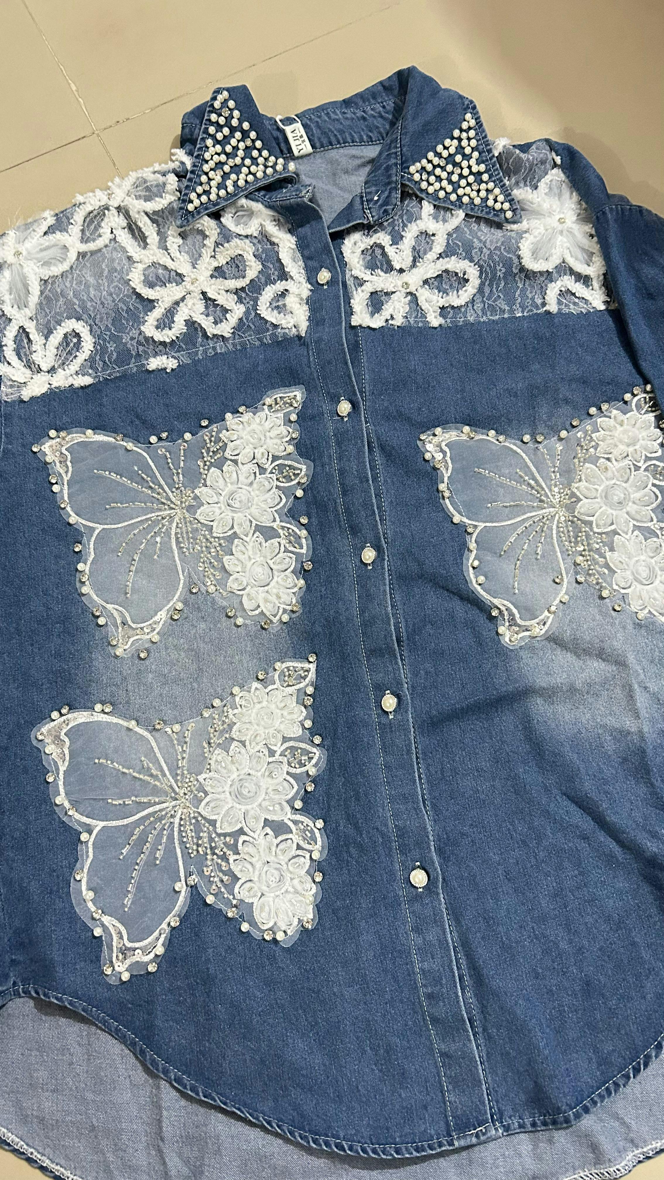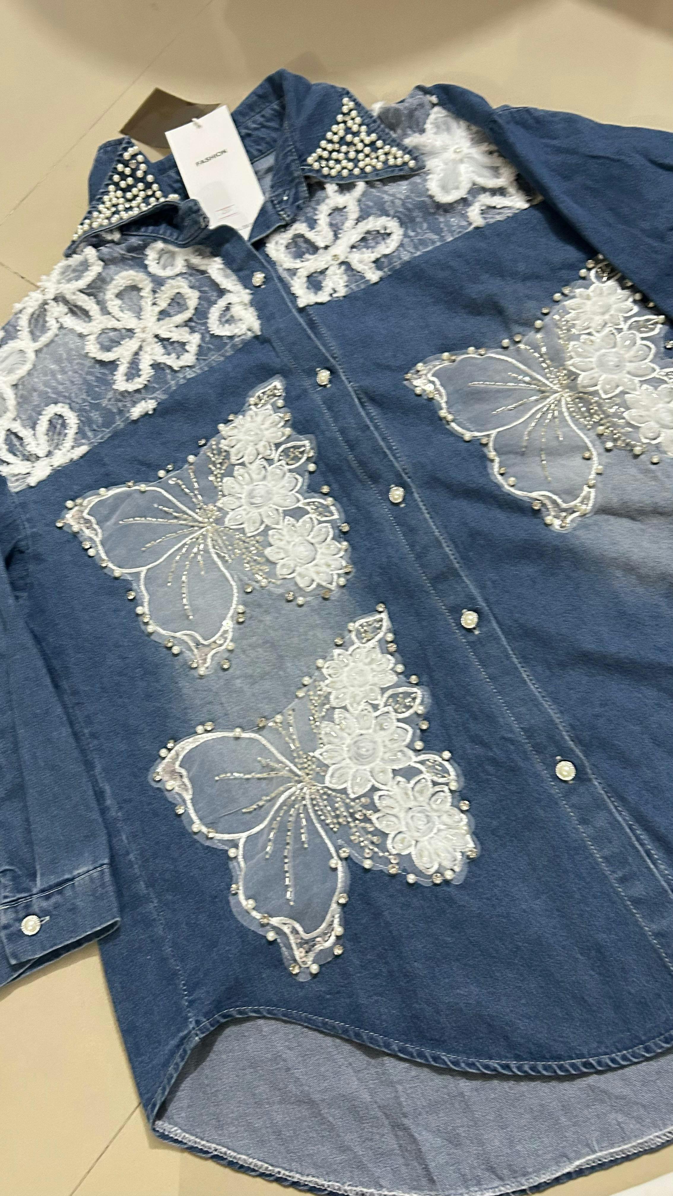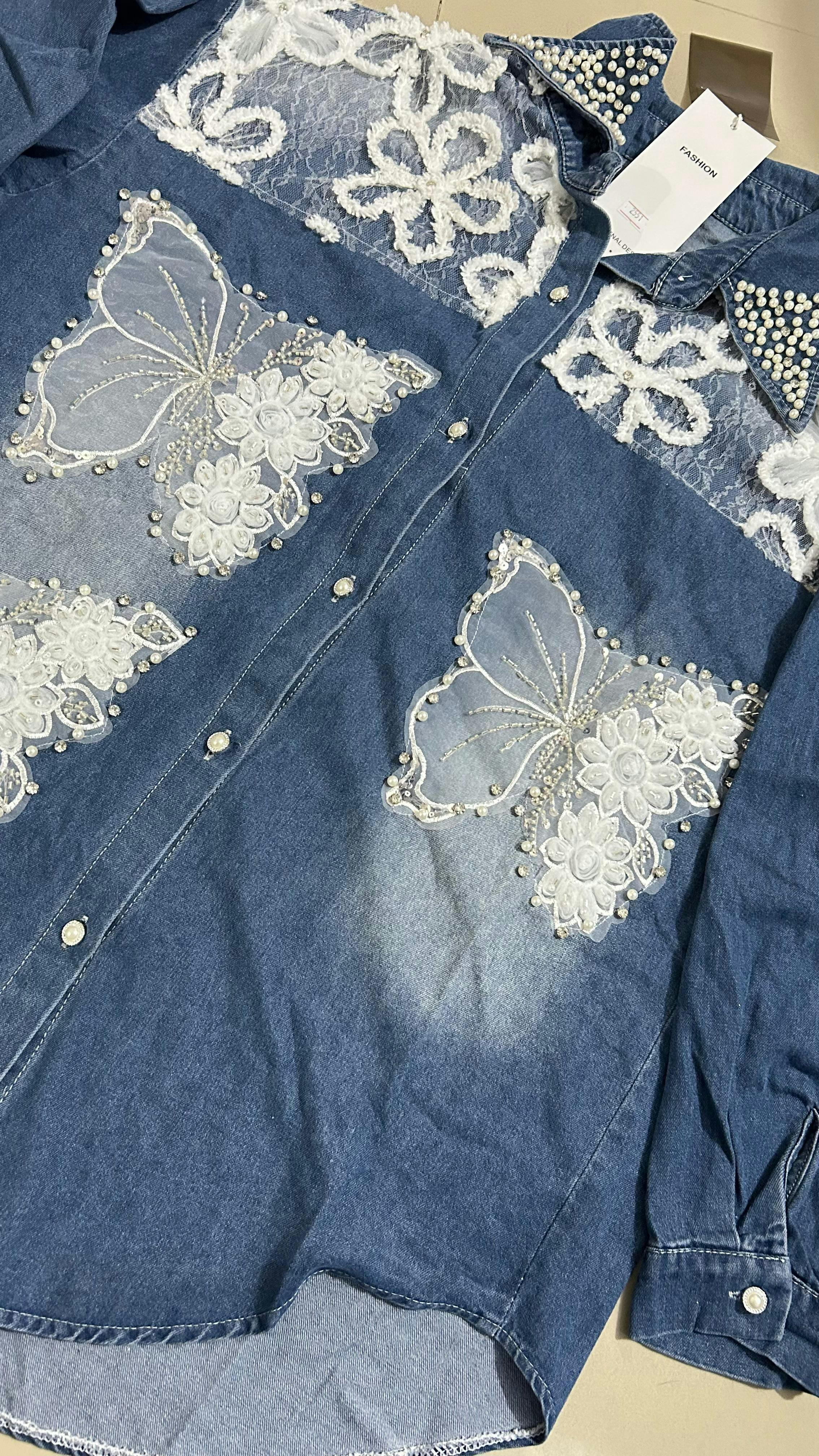 🦋 Denim Shacket – Butterfly Applique & Pearl Detailing