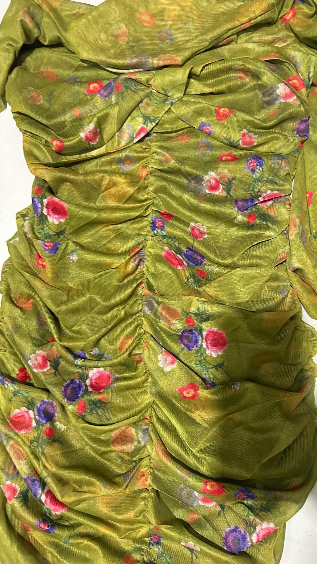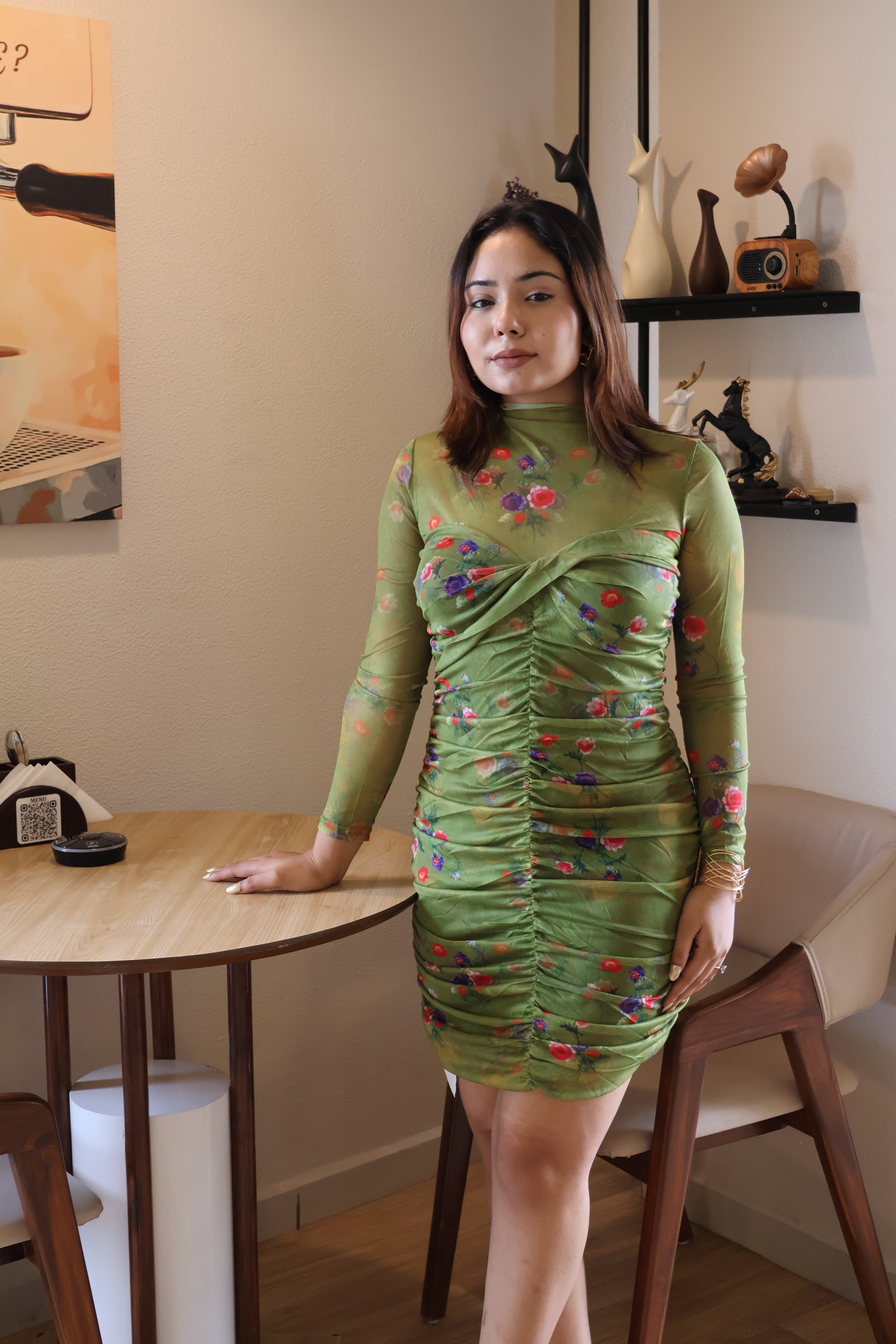 🌿 Green Floral Ruched Mesh Bodycon Dress (Imported)